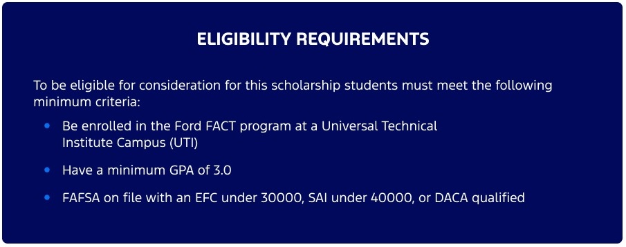 The Ford FACT "Pedal to the Metal" MSAT Tuition Scholarship assists students enrolled in the UTI Ford FACT program. Applicants may begin applying for this scholarship starting 4-months prior to the start of and through completion of their Ford FACT program. Each award shall be for $4,500 in tuition and is awarded once.